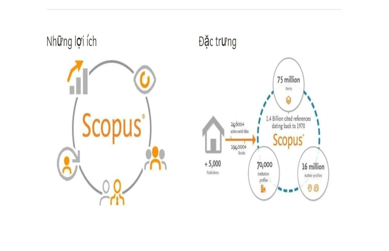 - Những lợi ích Scopus tập hợp chất lượng và phạm vi dữ liệu vượt trội, khả năng phân tích tinh vi, tối ưu hóa quyền phân tích và quy trình làm việc của nhà nghiên cứu, đồng thời trao quyền cho việc ra quyết định tốt hơn. - Những đặc trưng Scopus lập chỉ mục nội dung từ 24.600 đầu sách đang hoạt động và 5.000 nhà xuất bản được kiểm tra và lựa chọn nghiêm ngặt bởi hội đồng đánh giá độc lập, đồng thời sử dụng kiến trúc siêu dữ liệu cơ bản phong phú để kết nối mọi người, các ý tưởng và tổ chức